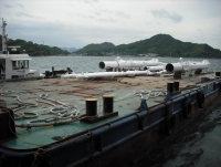 クレーンで吊って、台船まで運びます。